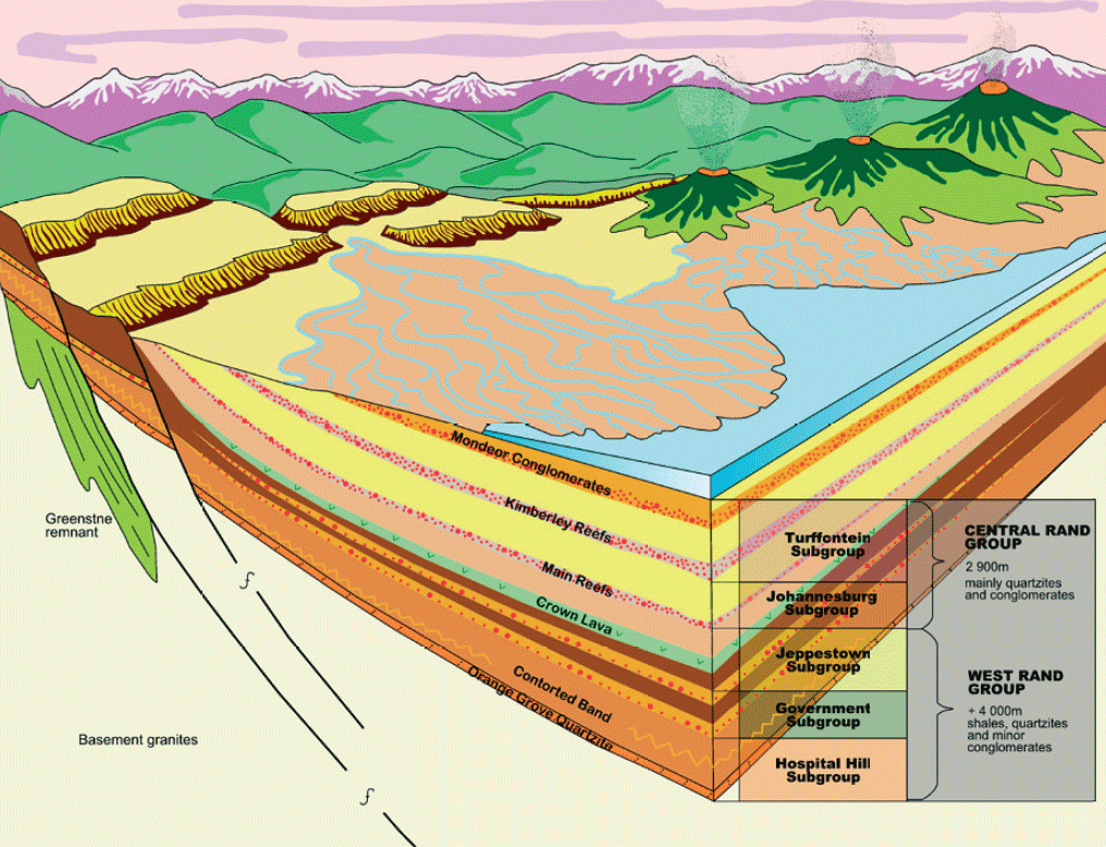 This basin contains gold reefs embedded in ancient sedimentary rock, formed over 2 billion years ago. These deep-level deposits are accessed through underground mining, some of which reaches depths of over 4 kilometers.